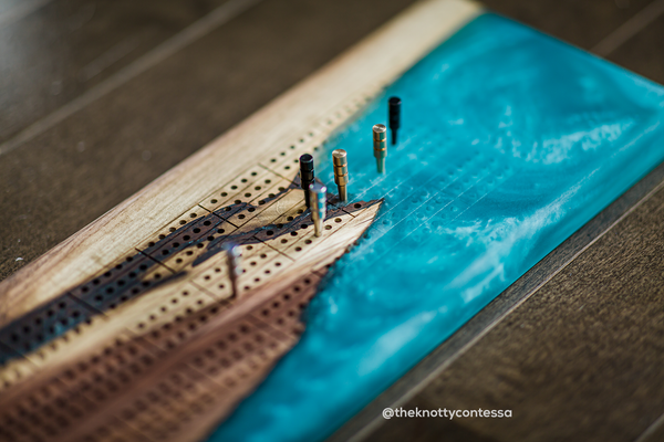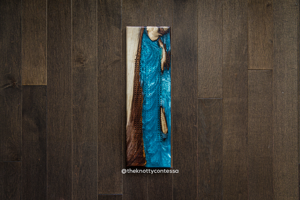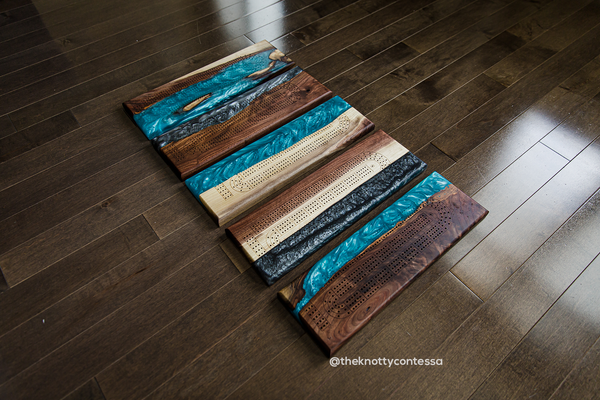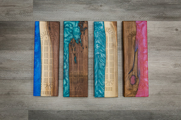 Our 29 Hand Luxury Live Edge Epoxy Cribbage boards are made with ethically sourced Ontario wood and Canadian epoxy. Each board comes with nine metal playing pegs. All boards sanded, polished and sealed with matte sealer.