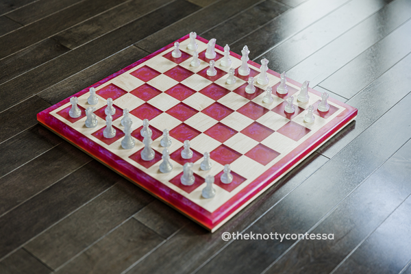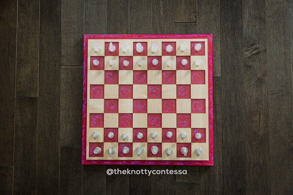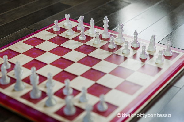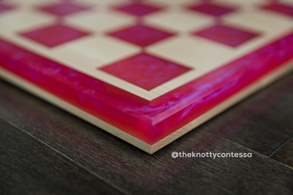 Customize your own International Master solid Maple Chess / Checkers Board. This board has many customization options. You can choose your colour of epoxy to suit your style and a choice of Cherry or Walnut hardwood for your border. Take it one step further with our striped pattern, also customizable.