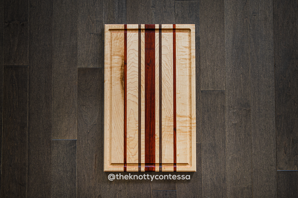 This elegant cutting board is handcrafted from White Maple, African Padauk and Ontario Black Walnut. Padauk is an exotic African Hardwood and is well known for its deep colour and wonderful natural luster. It is also very resistant to rot making it a great option for cutting boards that get a lot of use! All boards sanded, polished and sealed FDA approved food-safe sealer. With each purchase of a cutting board, you will receive a complimentary tin of The Knotty Contessa's Board Butter Wood Conditioner.