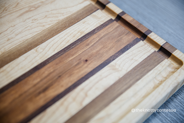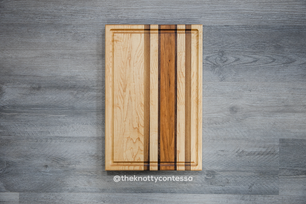 This elegant cutting board is handcrafted from White Maple with Black Walnut, and Cherry. All boards sanded, polished and sealed FDA approved food-safe sealer. With each purchase of a cutting board, you will receive a complimentary tin of The Knotty Contessa's Board Butter Wood Conditioner.