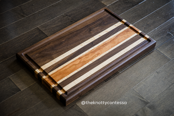This elegant cutting board is handcrafted from Black Walnut, Maple, and Cherry. All boards sanded, polished and sealed FDA approved food-safe sealer. With each purchase of a cutting board, you will receive a complimentary tin of The Knotty Contessa's Board Butter Wood Conditioner.