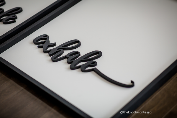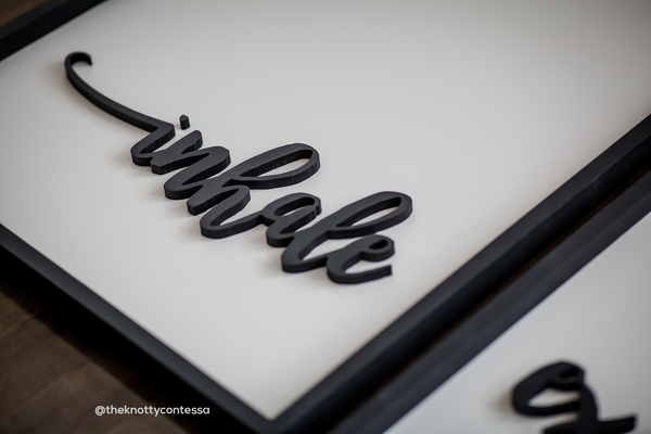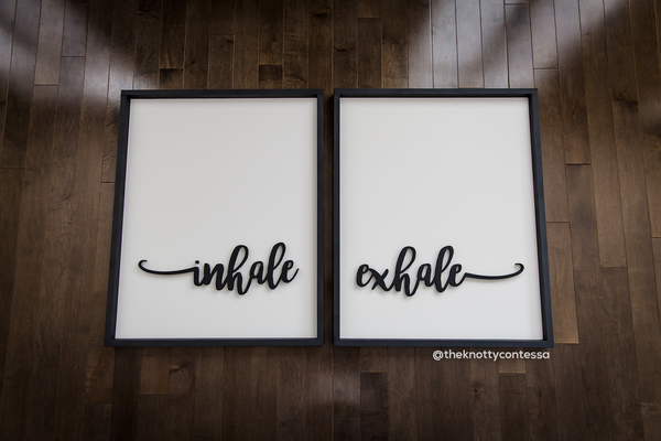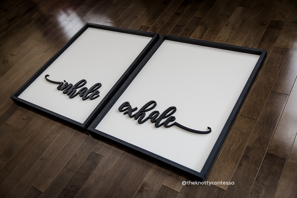 This two sign gallery compliments any décor in it's neutral colours and calming font. Made from 1/2 inch Baltic Birch painted white, with a raised 1/2 inch "inhale" "exhale" painted black. Farmhouse style frame is painted matte black.