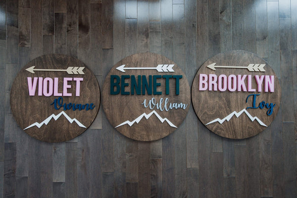 Our Arrow and Mountains Nursery round features an arrow accent above the child's name in addition to the mountain scape below. The Arrow and Mountains Nursery Round is built on a 5/8" thick backer stained in your choice of colour with a combination of 1/2 inch first name and 1/4 inch middle name(s) letters. The arrow and mountain accent pieces are 1/4 inch painted in the corresponding colours.