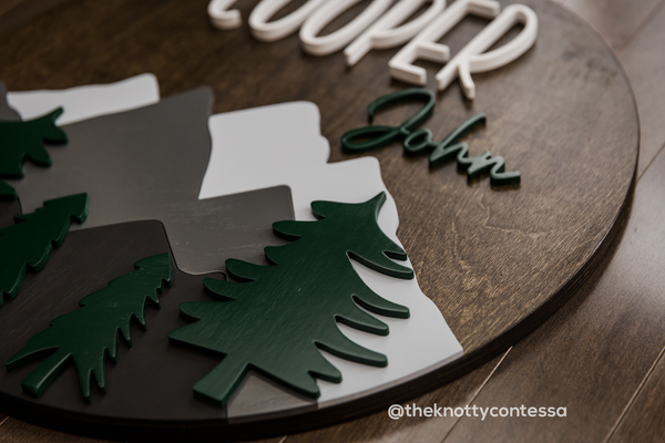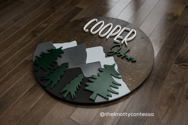 Our Layered Mountains and Evergreens Nursery round features a multi coloured mountain scape featuring three layed mountains with trees that are raised above the mountains for a 3D effect. The Layered Mountains and Evergreens Nursery Round is built on a 5/8" thick backer stained in your choice of colour with a combination of 1/2 inch first name and 1/4 inch middle name(s) letters. The mountain accent pieces are 1/4 inch and the evergreens are 1/2 inch painted in the corresponding colours.