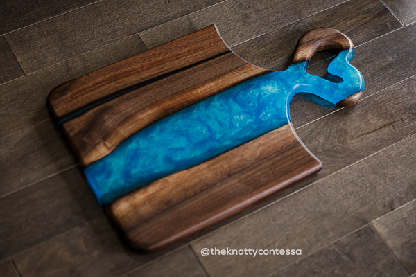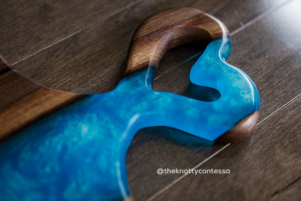 Elegant live-edge charcuterie board handcrafted from Ontario Black Walnut and combined with Gold Blue epoxy colour. All boards sanded, polished and sealed with FDA approved food-safe sealer.