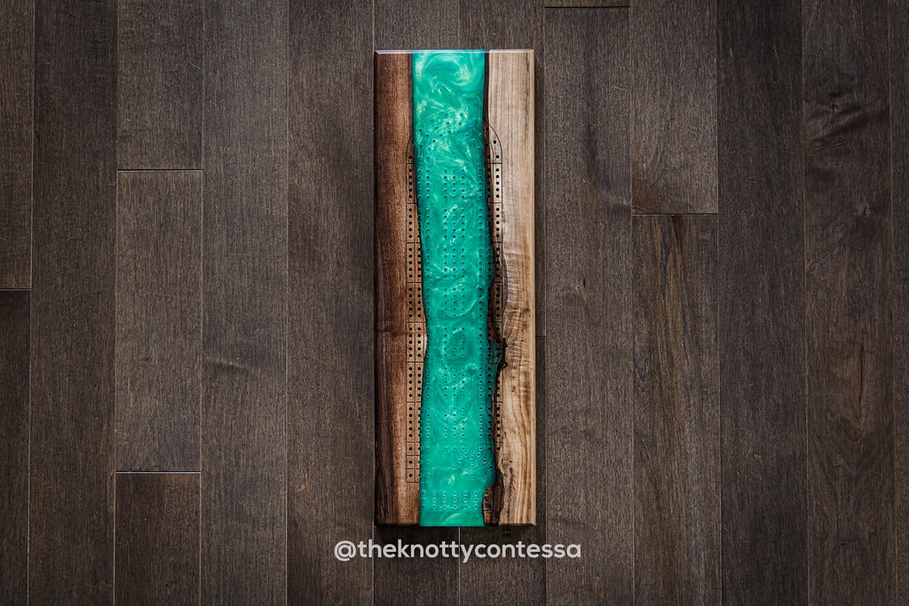The 29 Hand Luxury Live Edge Cribbage Board - Black Walnut / Paris Green Epoxy - CB-PGR-001