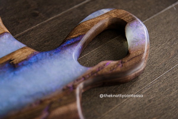 Elegant live-edge charcuterie board handcrafted from Ontario Black Walnut and combined with Glacier Blue Chameleon epoxy colour. This chameleon colour looks a dominant light blue with dark blue accents in the swirls. All boards sanded, polished and sealed with FDA approved food-safe sealer.